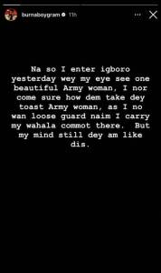 Grammy award winner, Damini Ogulu better known as Burna Boy, has shared his encounter with a beautiful female soldier who caught his eyes on Saturday, January 8.
