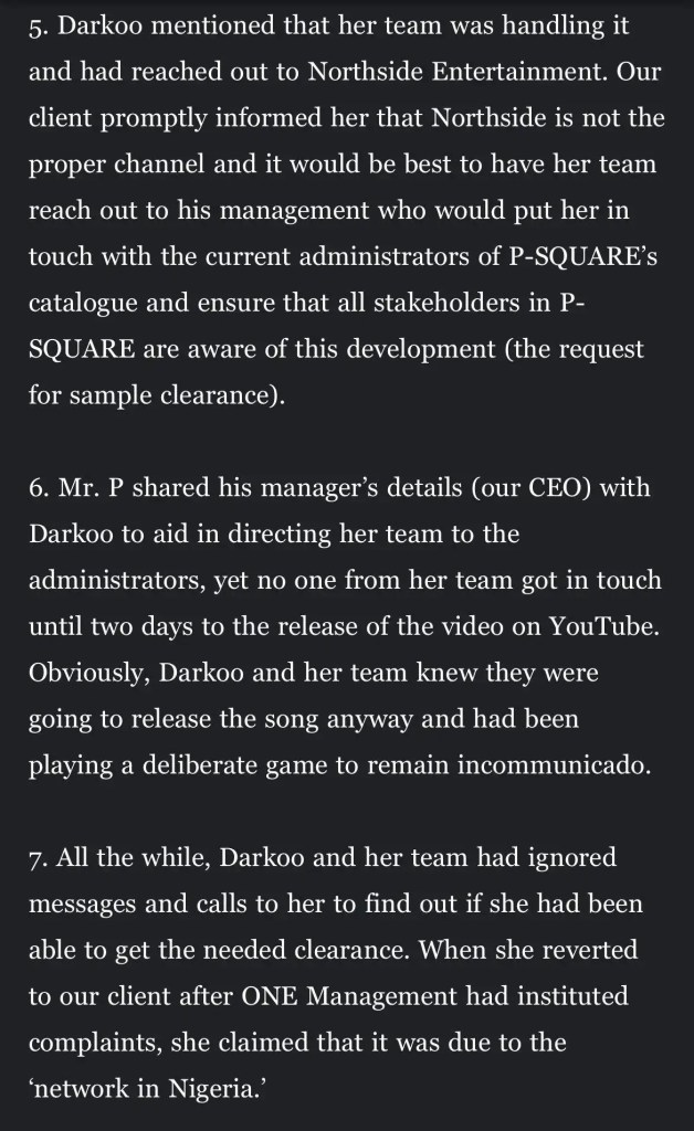The release further revealed that Darkoo offered to have the veteran as a guest artist on the remix but contrary to her claim that Mr. P insisted on being on the original, he communicated his unavailability for the proposed video shoot.