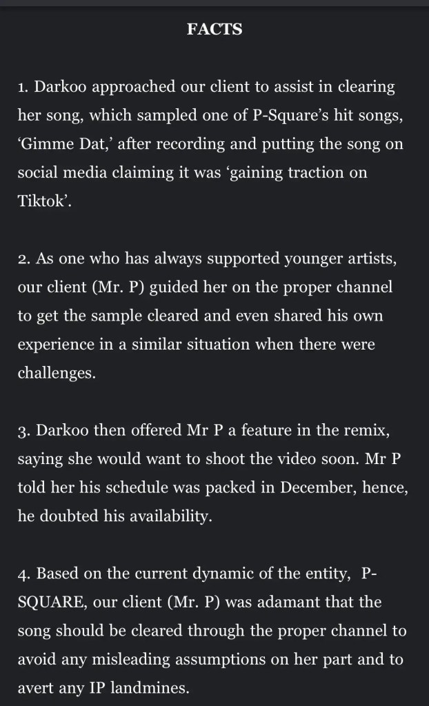 Peter Okoye AKA Mr. P’s management has come out to set the records straight after Darkoo accused the veteran star of sabotage.